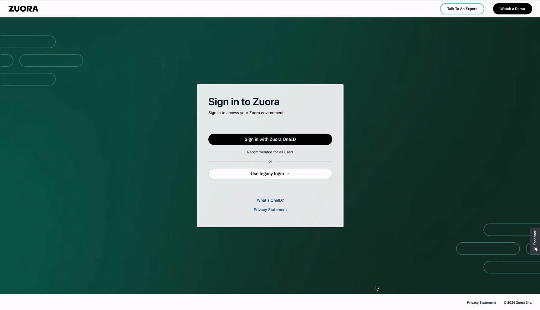 At Zuora, we're continuously improving security, usability, and consistency across our platform. As part of this effort, we're introducing a redesigned login experience that makes Zuora OneID the primary authentication method for accessing your Zuora environment.